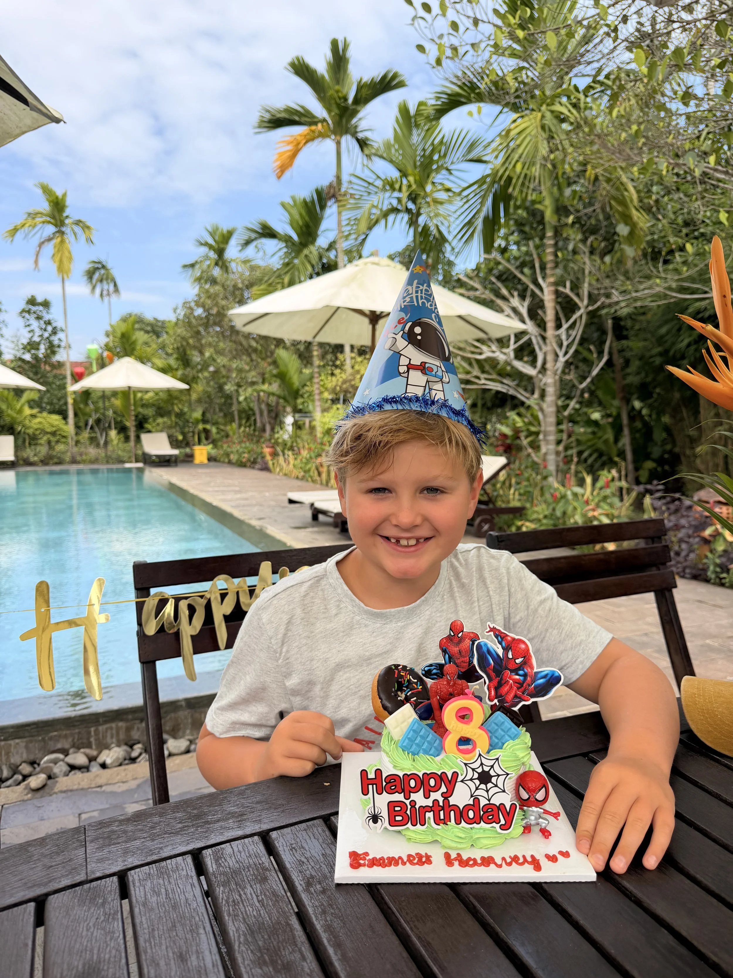After presents, we headed down for another lovely breakfast by the pool. When we mentioned to Hung, the owner of the resort, that it was Emmett’s birthday, he was genuinely surprised and wished him a happy birthday. We went back upstairs to finish getting ready, and about half an hour later there was a knock on the door. Hung had set up balloons at our breakfast table, put up a happy birthday banner, and organised a birthday cake for Emmett. It was such a generous, unexpected gesture. The cake was absolutely delicious, we all sang happy birthday, and it was one of those moments that really sticks with you. The people here are such kind, open, generous people. We’ll definitely be doing something special for them before we leave to say thank you.