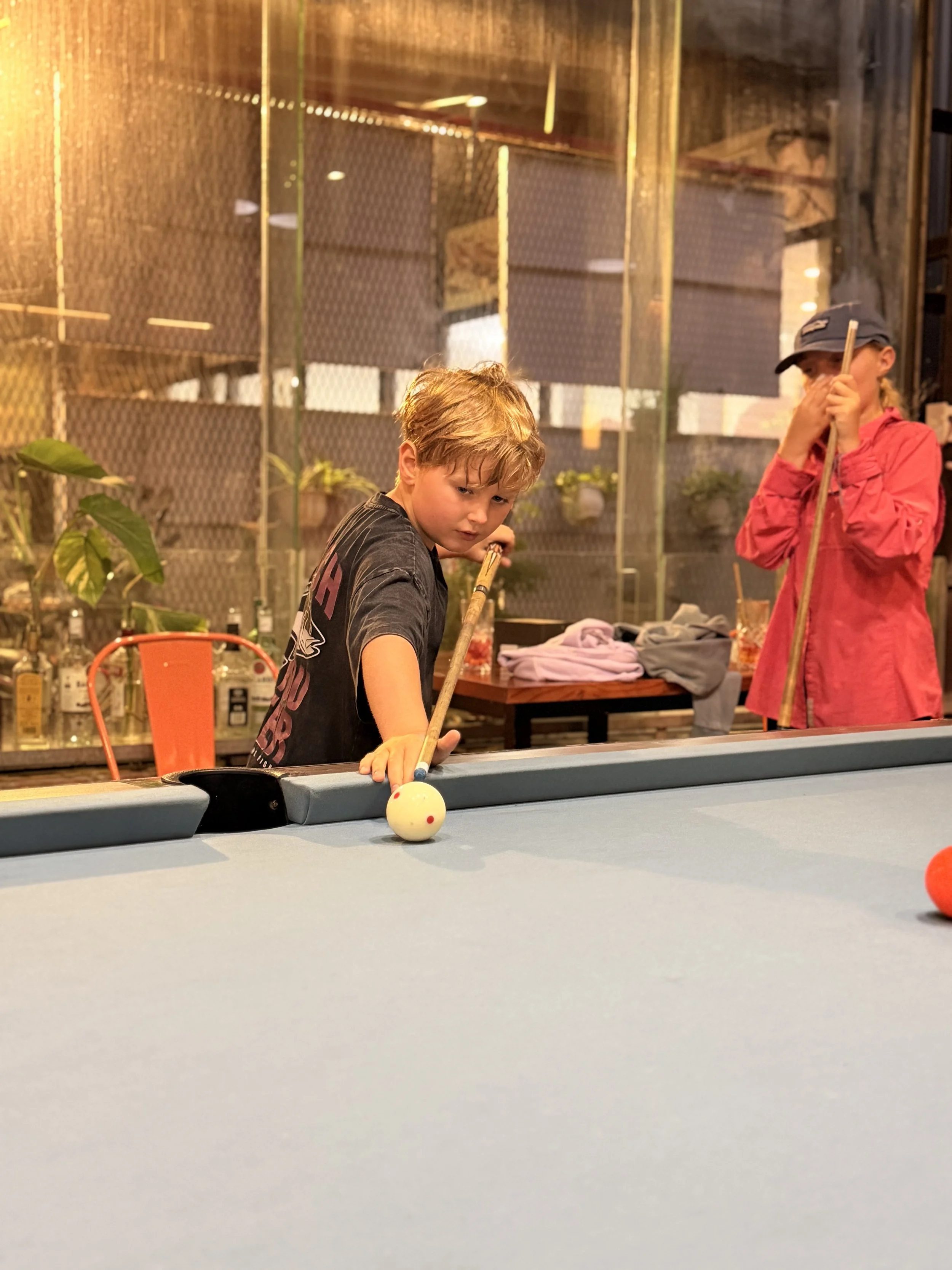 Back at the room, the weather had stayed miserable all day. Cold, rainy, on and off drizzle. The kids were starting to perk up again, so I took them out to give Kia a break. We rode into town and found a pub with a pool table. A few games of pool, iced teas for the kids, a couple of beers for me, and a nice way to kill time out of the rain.
